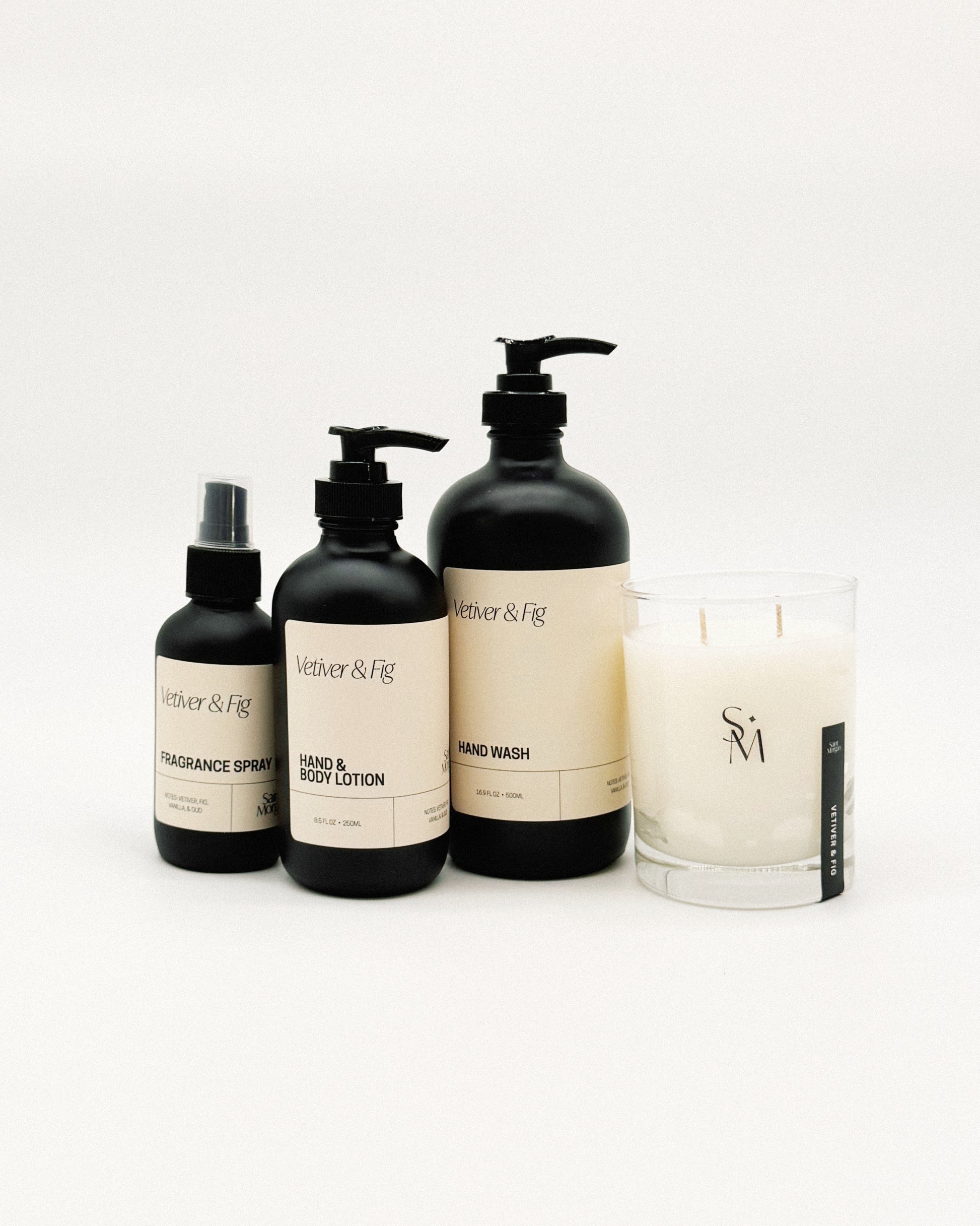This set is comprised of the Vetiver & Fig Candle, Hand Soap, Lotion, and Fragrance Spray. Your home & body essentials, all in one.